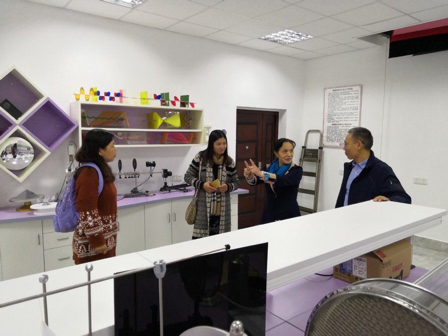 双方就探索实验室的运行、课程建设、科普工作的开展、志愿者招募与培训等进行了深入交流和讨论。调研小组就“如何基于演示实验室开课”这个问题向赵敏老师请教,具体讨论了演示实验如何有效弥补大学一年级学生高中物理欠缺的部分,包括知识、实验和思想方法;如何从演示实验中提炼出拓展实验项目;拓展实验项目的实施模式和时间安排该怎样;实验项目成果如何界定等方面的问题。赵老师也就同济大学文科物理课程、基于探索实验室的课程开课做了介绍,从课程规模、授课内容、课题形式、考核方式等方面做了解释和说明。