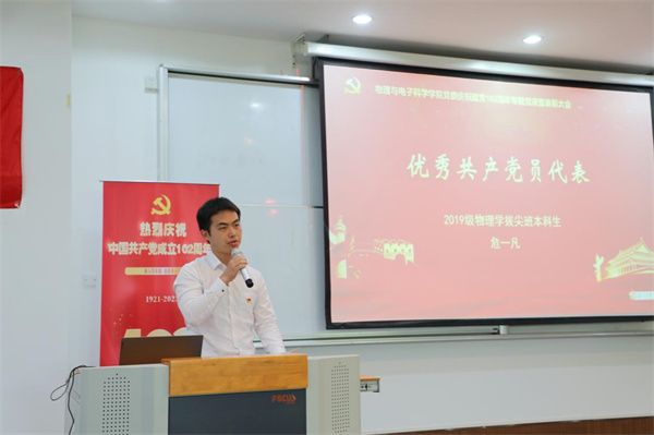 2019级物理学拔尖班本科生危一凡、精密光谱科学与技术国家重点实验室2018级研究生党支部书记吴修齐、电子科学系教工党支部书记黄荣作为获奖代表依次发言。