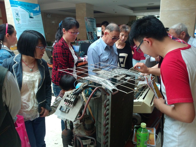 1点左右,准备工作基本就绪,于是各自宣传工作开始了。小组的各成员一部分在各自的展位为前来的居民展示、宣传科普知识,一部分成员向附近的居 民发放宣传册,并热情的邀请居民到展位前进一步了解。凉爽的天气为科技节的开展提供了有利的条件,许多居民被广场上的热闹的活动氛围吸引前来。“社区防盗 系统安全”小组,利用展板、海报等,为大家展示了社区防盗系统,并发放宣传册,给居民提供了一些防盗的有效措施。不时有居民参与其中和大家讨论小区、家庭 防盗问题。“路灯节能探讨”小组也通过展板、海报,对各种路灯进行了节能对比,向路人介绍了社区路灯如何设置才能发挥最大功效,以及家用灯具的选择方法 等。“家用电器安全”小组则发放宣传册结合解说,对电器使用进行了宣传。“物理生活安全”小组,利用物理专业优势,将生活中的物理现象融入课题,以海报、 宣传册方式,提升了大家对物理现象的认识,也激发了大家的好奇心。最有亮点的则是“常用家用电器安全使用”小组了。他们回收了一台旧空调,并自行进行了拆解、研究,然后将空调的内外机放置在了现场,吸引了大批居民前来观看、询问。小组成员向居民们介绍了空调的结构和工作原理,普及了空调的维修和清洗工作, 比如哪些部件最易沾染灰尘,怎样清洗,遇到故障如何自己查看、维修等等,还解答了一些居民提出的空调漏水等原因,让居民十分受用。另外,他们还发放了宣传册,让居民在遇到问题时,可以通过小册子自行解决问题。此外,老师们带的监控摄像系统以及智能防盗系统着实让路人开了眼界。老师一边为大家介绍系统的工作原理和构造,一边让居民参与其中,亲手操控系统,体验科技的力量与神奇之处。