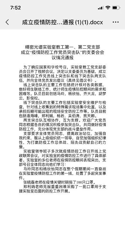 精密光谱科学与技术国家重点实验室第一教工党支部召开线上组织生活,成立党员突击队,明确人员分工,做好重点实验室远程连线,现场设备检查、安全防控、数据拷贝传输等紧急需求工作。