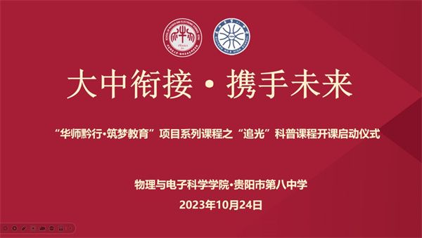 10月24日下午,艾弗森贝博ballbet官网依托“追光”科普宣讲团,面向贵阳八中开设第一期“追光”科普课程,共建“追光”科普社团,贵阳八中高一至高二,共22个班级,约1000多名学生在线参加。