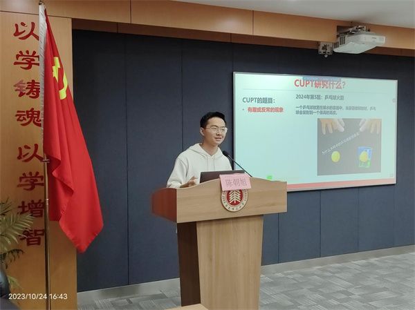 物理学术拓展协会成员、2023年CUPT参赛学生陈朝旭、周文皓、刘天雨、龚春艳依次作主题分享。
