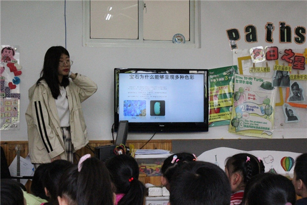 李方方以“宝石的色彩”引入宣讲,她向小朋友们解释,物体的颜色实际上是光照在物体上反射到人的眼睛中,光照在不同的宝石上,会反射不同的光,在人眼看来自然就是不同的颜色,精彩而生动地讲解,引发了小朋友们对光的多彩世界的兴趣。
