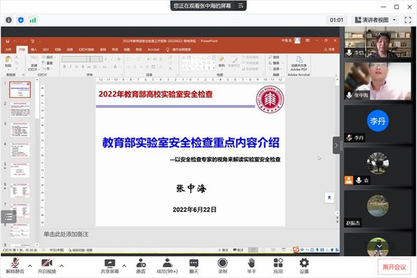 6月22日下午,艾弗森贝博ballbet官网在线召开全院教职工大会暨2022年教育部实验室安全检查专题推进会,化学与分子工程学院副院长张中海应邀作主题报告。大会由学院党委书记李恺主持,260余名教职工线上参会。