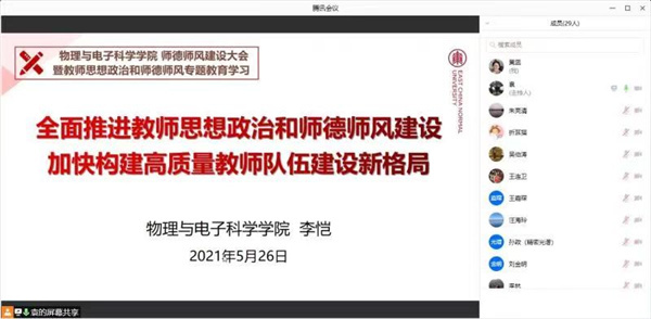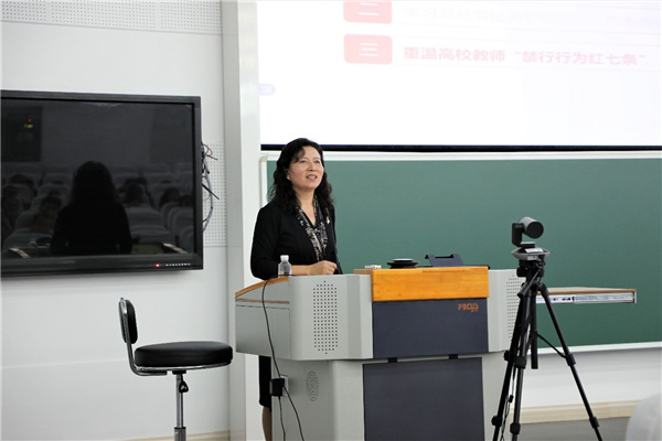 李恺以“全面推进教师思想政治和师德师风建设,加快构建高质量教师队伍建设新格局”为题开展师德师风教育。她向参会教职工传达了教育部开展师德专题教育会议相关精神,学习了习总书记关于师德师风的重要论述摘编,重温了高校教师“禁行行为红七条”和“职业行为十项准则”,通报了违反高校教师职业行为十项准则典型案例。她谈到,习近平总书记对广大教师提出了“四有”好老师、“四个引路人”、“四个相统一”等要求,强调要把师德师风建设摆在首要位置。这一系列重要论述和指示,为新时代教师思想政治工作和师德师风建设指明了前进方向,提供了根本遵循。希望学院广大教职工认真学习相关文件精神,坚定理想信念、厚植爱国情怀、涵养高尚师德,为党育人、为国育才,以优异成绩庆祝建党百年。