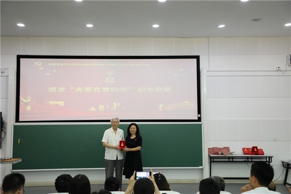 会上,隆重举行了 “光荣在党50年”纪念勋章颁发仪式,学院党委书记李恺为老党员同志代表、校“优秀共产党员”获得者马龙生教授颁发纪念章。