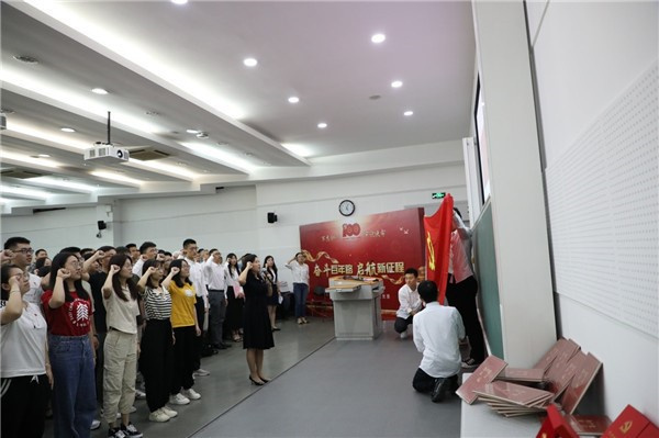 “誓言”篇章,学院党委书记李恺带领学院全体师生党员面向党旗重温入党誓词,铿锵有力的宣誓声响彻报告厅。