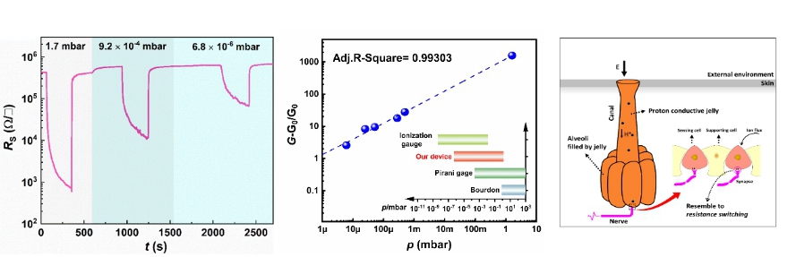 WO3阻变对真空度的高度灵敏性(左);真空计的性能测试结果(中);洛伦兹壶腹结构示意图(右)