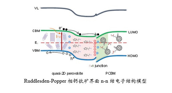 有机-无机杂化钙钛矿光伏电池(Perovskite Solar Cells)因光电性能优异、制备工艺简单备受关注。当前钙钛矿器件的研究主要集中在结晶、取向调控等方面,以制备高质量的钙钛矿薄膜,但是对钙钛矿界面电子结构缺乏足够认识。界面电子结构失配导致的电荷输运受阻、电势损失等问题是器件非辐射复合损失的重要来源,这无疑是实现高效率器件的瓶颈。鉴于此,课题组利用光电子能谱原位表征技术(UPS/IPES/XPS),系统分析了维度调控下的(PEA)2(MA)n-1PbnI3n+1(n = 1, 3, 5, 40, ∞)钙钛矿与电子传输层PCBM界面电子结构与器件能量损失之间的构效关系,提出了Ruddlesden-Popper相钙钛矿界面电子结构模型。研究发现,有别于纯二维和三维钙钛矿(n = 1,∞)与PCBM界面形成的传统p-n型异质结,准二维钙钛矿(n = 3, 5, 40)与PCBM界面形成了n-n结,从本质上减少了界面处的空穴浓度,抑制界面复合。N-n结的形成归因于钙钛矿表面分布的多余PEAI配体产生界面偶极,以及电荷再分布,降低了准二维钙钛矿表面的功函数,该界面电势梯度能够促进光生载流子从钙钛矿晶格传输到钙钛矿与PCBM界面。在空间上,表面配体分隔了富电子区(PCBM)和富空穴区(钙钛矿),使电子与空穴复合机率进一步降低。通过界面物性分析与器件性能相结合,本身结晶性较弱的n = 5准二维钙钛矿光伏电池因具有更加匹配的界面电子结构,表现出最小的开路电压损失,进一步验证了该界面工作机制。该工作对器件界面电荷传输与能量损失机制提供了深入的理解(Advanced Energy Materials, 2020, 10, 2000687, 封面文章)。