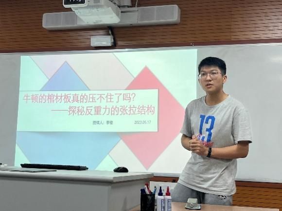 本科生组的参赛选手带来了更多有趣的科普实验。李俊同学在《牛顿的棺材板真的压不住了吗——探究反重力的张拉结构》的实验设计部分,拿出了自制的一个个小巧玲珑的结构,通过剪断不同位置的细线,帮助同学们对“反重力结构”进行受力分析;撒米多同学通过模具,讲述《受迫振动》中神奇的物理现象;肖雁之同学全面、系统地分析了纸飞机中的物理学原理。