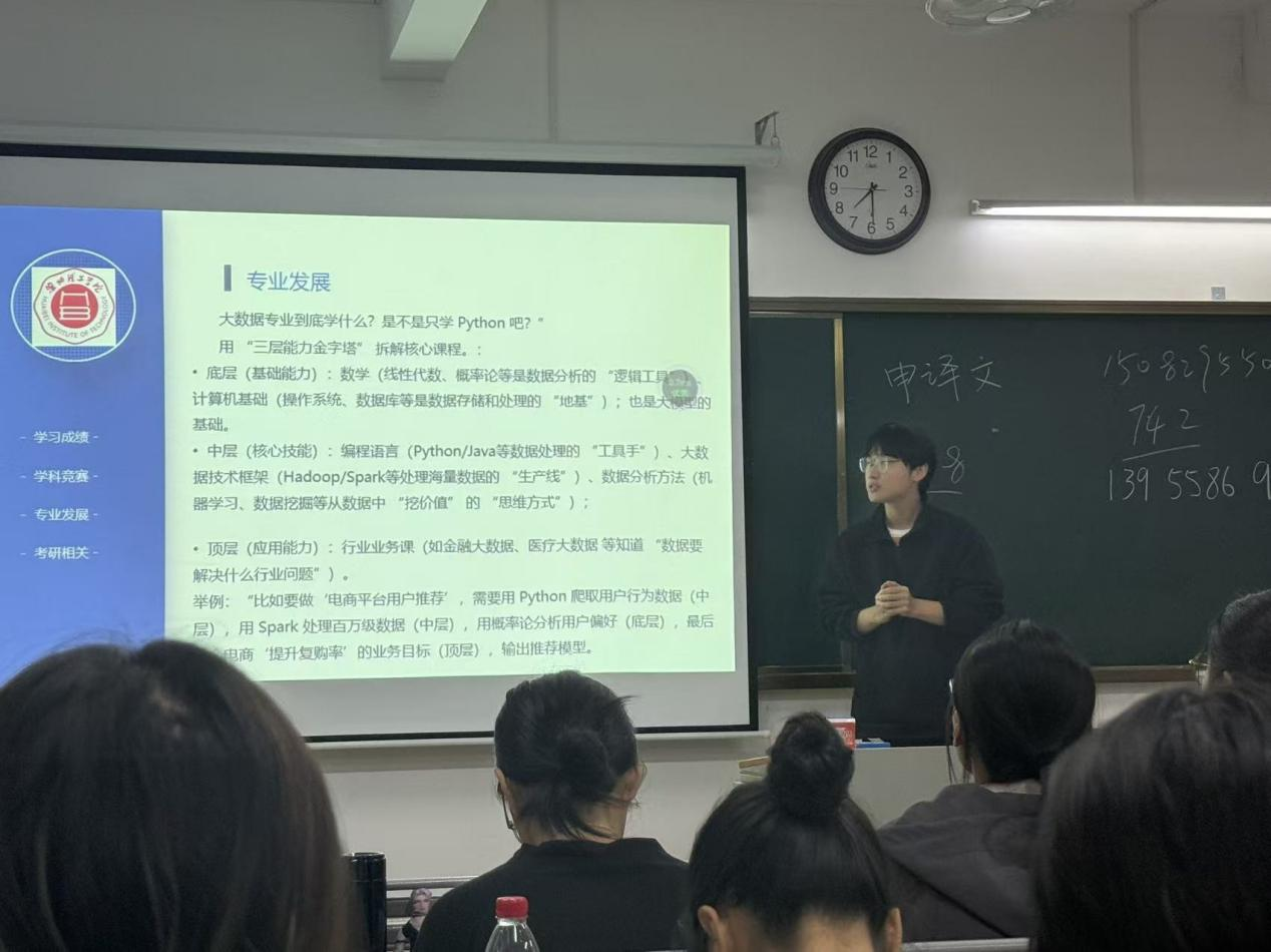见面会上,各专业班主任首先聚焦专业核心价值与课程体系,为新生搭建系统的专业认知框架。人工智能相关专业班主任结合学科前沿动态,梳理“基础课程—核心技能—实践应用”的进阶路径,解读机器学习、计算机视觉、自然语言处理等核心方向在智能制造、智慧城市、医疗健康等领域的应用场景,通过数据对比展示专业就业前景与岗位能力要求;软件工程专业班主任阐述该学科作为数字经济核心支撑的重要性,明确“懂技术、会创新、能实践”的复合型人才培养目标,覆盖软件设计、开发、测试到维护的全流程知识体系;数据科学与大数据技术专业班主任以“三层能力金字塔”为模型,从底层数学与计算机基础、中层编程语言与技术框架,到顶层行业业务应用,拆解专业知识架构;电子信息工程专业班主任则从“学科交叉特性”“行业需求”出发,强调数学与编程基础对专业学习的关键作用,帮助新生建立对专业的清晰认知。