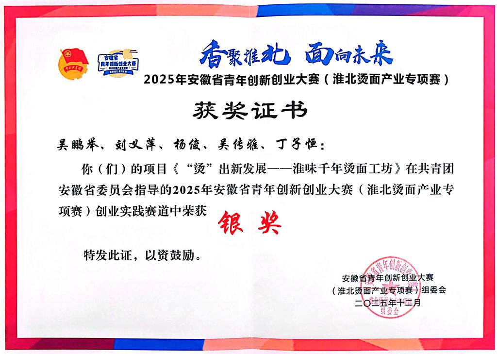 近日,2025年安徽省青年创新创业大赛(淮北烫面产业专项赛)决赛暨颁奖仪式在淮北市圆满落幕。今年会官方网站两支参赛团队凭借鲜明的技术特色与扎实的创新成果脱颖而出,分别斩获银奖与铜奖,为学院赢得荣誉的同时,也展现了电子信息专业青年助力地方传统产业升级的青春担当。