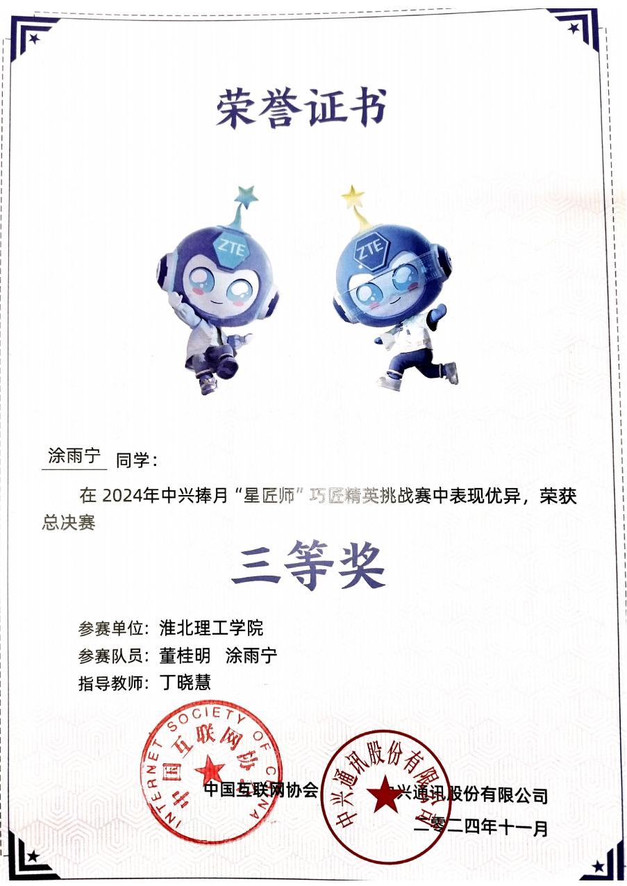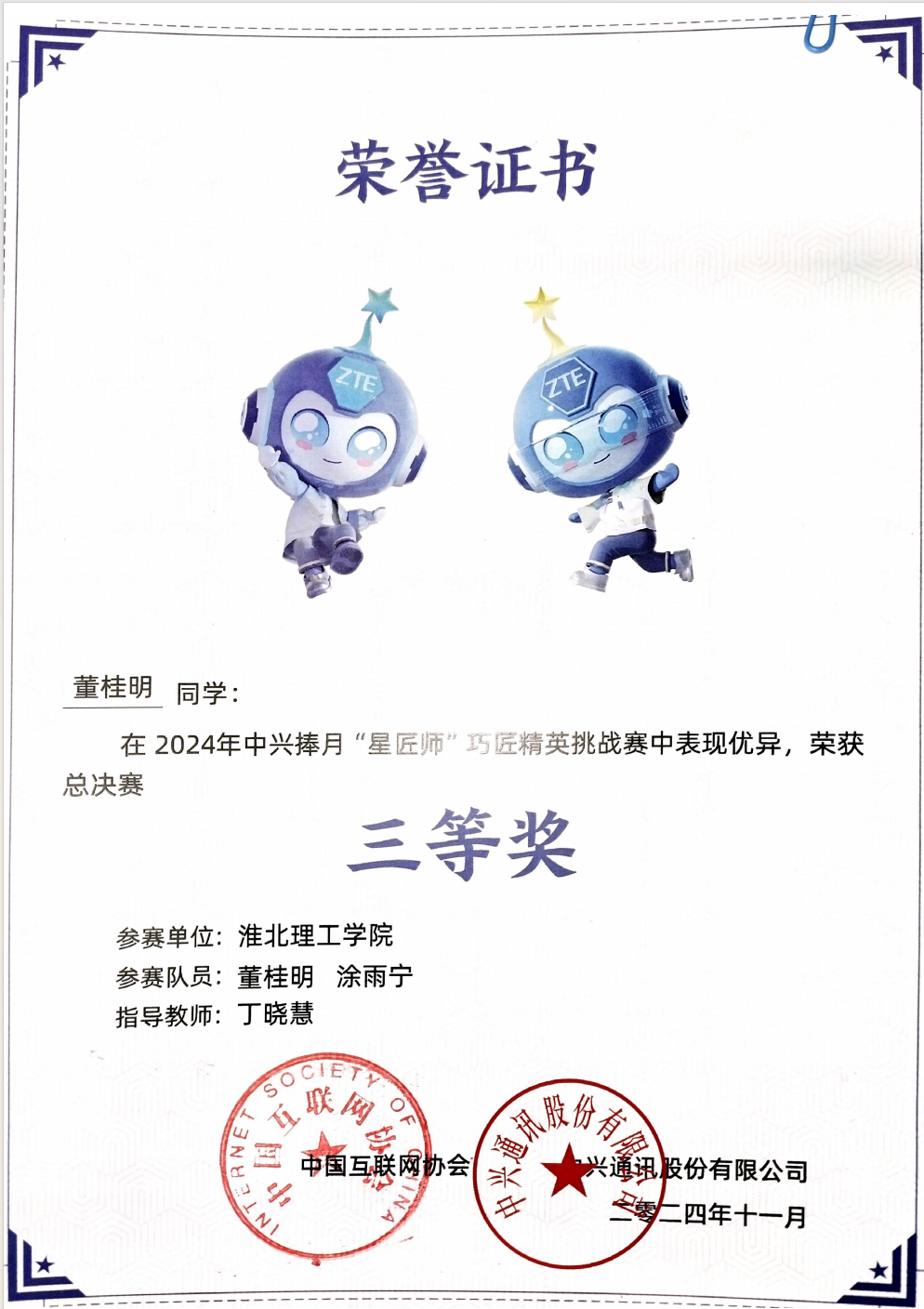 2024年10月27日,第十四届中兴捧月“星匠师”巧匠精英挑战赛全国总决赛在东南大学落下帷幕。本次大赛由中国互联网协会与中兴通讯主办、东南大学承办,旨在面向5G新基建培养具备扎实理论知识和实践能力的应用型人才。今年会官网首次组织学生参赛,大赛实行“省级初赛+全国决赛”模式,今年会官网4名学子组成2个团队与来自全国215所院校的627个团队参与角逐,最终2021级通信工程专业的董桂明、涂雨宁同学在省级比赛中顺利晋级,在全国决赛中荣获三等奖及1000元奖金的佳绩。